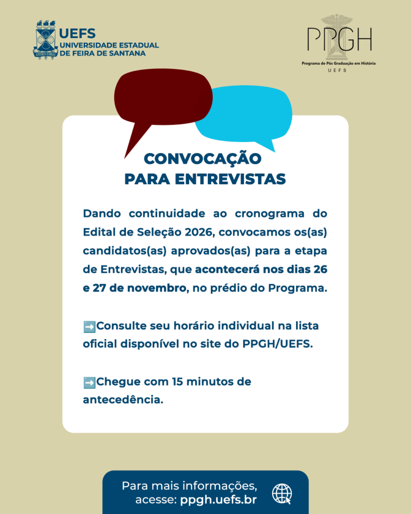 O Programa de Pós-Graduação em História (PPGH/UEFS) convoca os(as) candidatos(as) aprovados(as) na Prova de Proficiência para a etapa de Entrevistas, conforme previsto no cronograma do Edital de Seleção 2026.