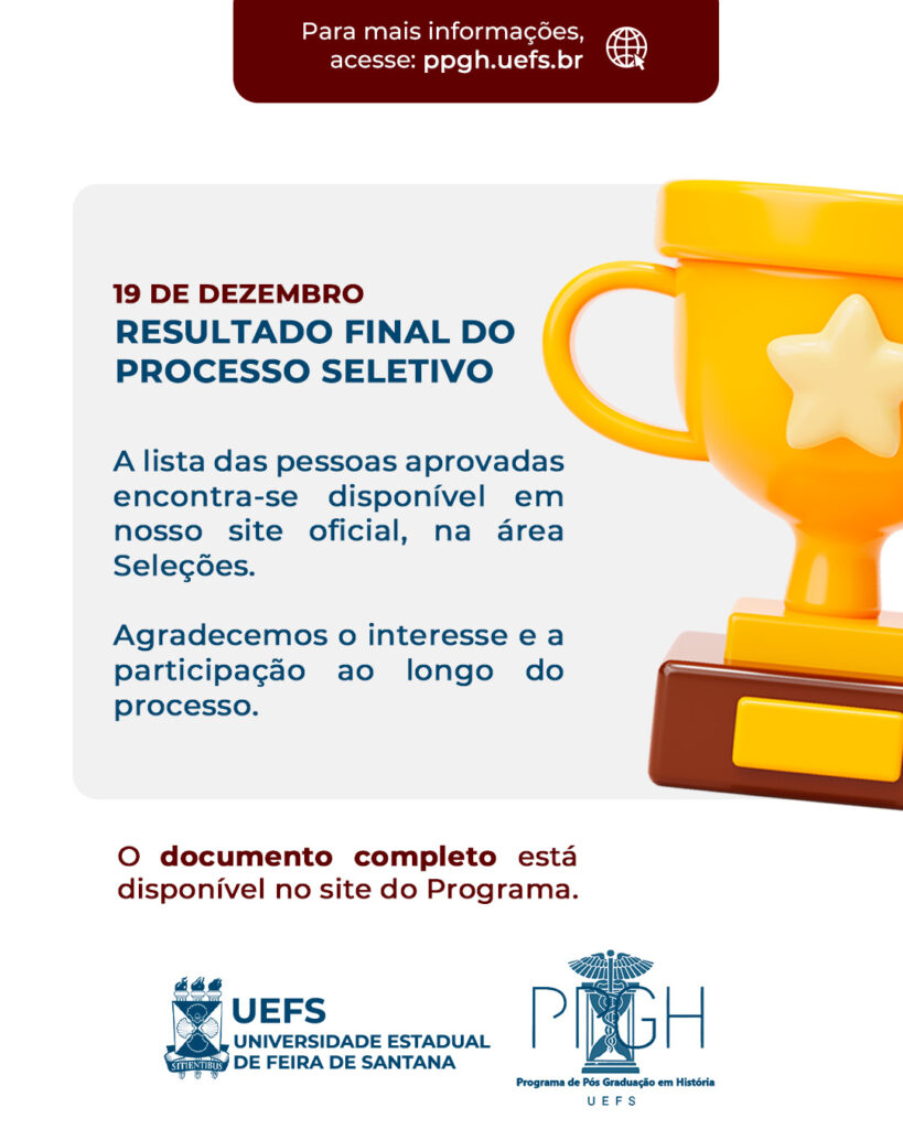 O Programa de Pós-Graduação em História torna público o Resultado Final do Processo Seletivo, após a conclusão de todas as etapas previstas em edital, incluindo o período de análise de recursos.
